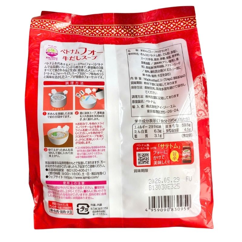フォー麺:米(ベトナム)、でんぷん、塩。